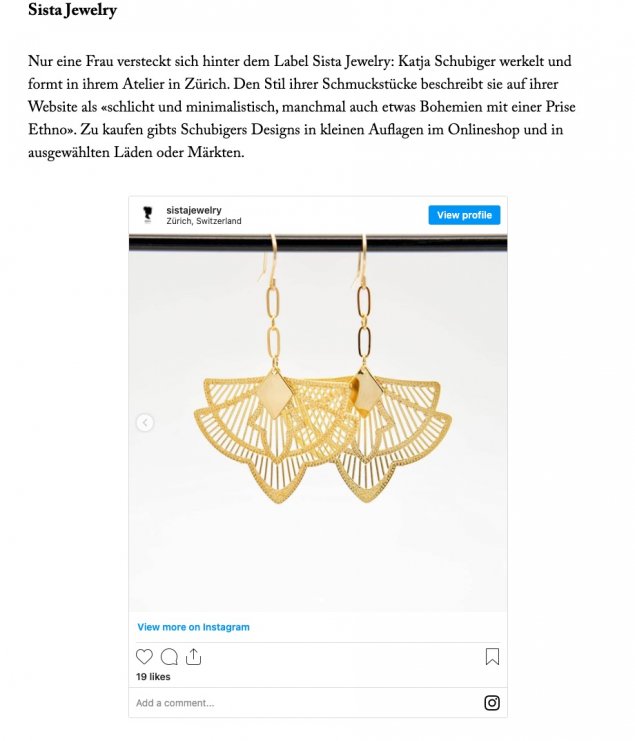 Hinter Sista Jewelry steckt ein kleines Ein-Frau-Schmuck-Atelier betrieben von Katja Schubiger in Zürich. Mit grosser Freude und Leidenschaft fertige ich schlichte, aber effektvolle Schmuckstücke an. Ich mag es mal schlicht und minimalistisch, manchmal darf es auch etwas Bohemian mit einer Prise Ethno sein. Dazu verwende ich möglichst hochwertige Materialien.